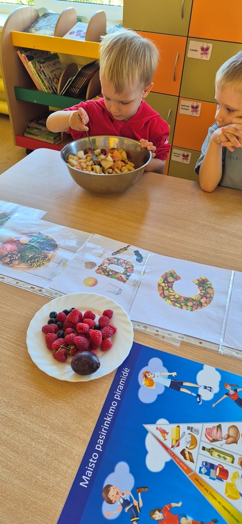 Vaisių kraitelėAš daržely Pats mažiausias, Ir saldžiausius vaisius valgau: arbūzus, kriaušes, avietes, obuolius. Ai, saldu! Kaip du medų... Rugsėjo 23 d. Mokytoja ir visuomenės sveikatos priežiūros specialistė „Drugelių“ grupės vaikučiams organizavo užsiėmimą apie sveiką mitybą. Užsiėmimo eigoje su ugdytiniais kalbėjome apie vaisių naudą sveikatai, aptarėme, kodėl svarbu valgyti vitaminų turinčius vaisius. Vaikai sužinojo, kad vaisiai yra ne tik skanūs, bet ir naudingi jų augančiam organizmui. Siekdami įtvirtinti žinias praktiškai, visi kartu gaminome sveiką vaisių desertą su jogurtu. Ugdytiniai noriai rinkosi vaisius, juos pjaustė, maišė su jogurtu ir ragavo. Desertas buvo ne tik sveikas, bet ir labai skanus – vaikai su dideliu džiaugsmu jį suvalgė. Degustuodami vaisius vaikai lavino skonio pojūtį, rūšiavo pagal spalvą, dydį, rūšį, skaičiavo, lygino kuris vaisius sunkesnis,didesnis ir pan..... Tai ne tik smagi, bet ir naudinga veikla – spalvų rušiavimas, skonių atspėjimų žaidimas, lavina smulkiąją motoriką, moko atsargumo bei ugdo savarankiškumą.
