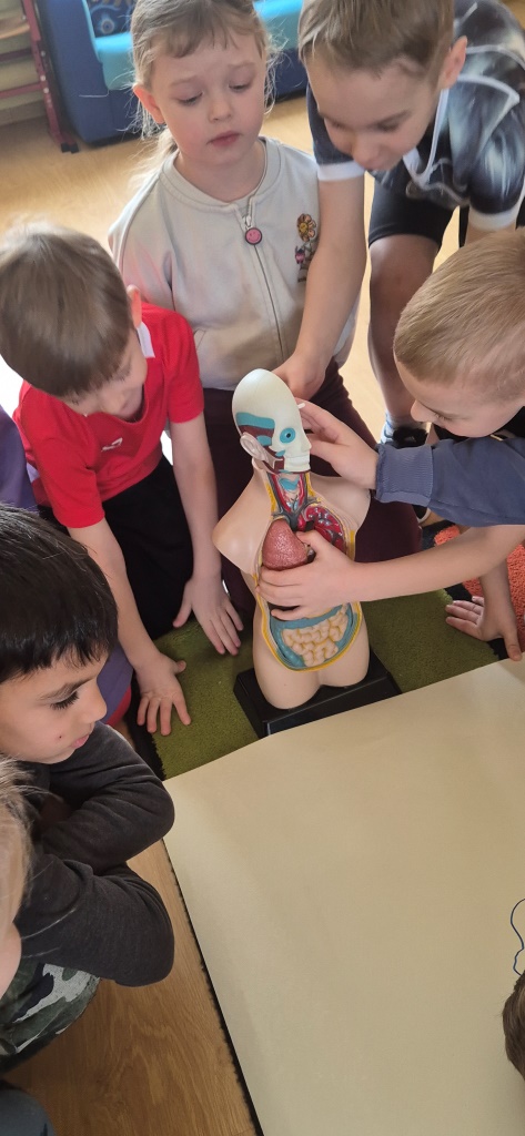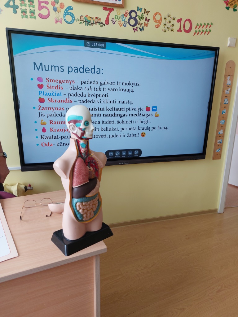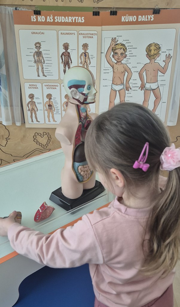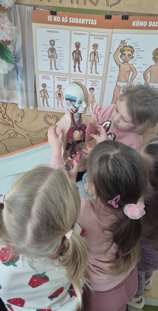 Mažieji tyrinėtojai: žmogaus kūnasVisuomenės sveikatos priežiūros specialistė „Ežiukų“, „Kodėlčiukų“ grupės ugdytiniams vasario mėnesį vedė užsiėmimą „Mano kūnas“. Užsiėmimo metu kalbėjomės apie žmogaus kūną, jo dalis bei tai, kodėl svarbu rūpintis savo sveikata. Vaikai mokėsi įvardyti pagrindines kūno dalis (galvą, rankas, kojas, liemenį), aptarėme, kam jos reikalingos ir ką galime su jomis veikti. Vaikai žiūrėjo skaidres apie žmogaus sandarą ir susipažino su pagrindinėmis kūno dalimis. Aptarėme, kad kūną sudaro galva, liemuo, rankos ir kojos. Vaikai mokėsi atpažinti ir parodyti šias kūno dalis ant savęs bei draugų.Taip pat kalbėjome apie penkis pojūčius – regėjimą, klausą, uoslę, skonį. Tęsdami veiklą „Mano kūnas“, šį kartą vaikai turėjo galimybę praktiškai susipažinti su žmogaus kūno sandara. Užsiėmimo metu jie apžiūrėjo kūno maketą su vidaus organais – širdimi, plaučiais, kepenimis, smegenimis, skrandžiu ir kitais organais. Vaikai galėjo atsargiai išimti (išardyti) organus iš maketo, juos apžiūrėti, aptarti jų paskirtį ir vėl sudėti į tinkamas vietas. Tokia patirtinė veikla padėjo geriau suprasti, kur mūsų kūne „gyvena“ organai ir kokį darbą jie atlieka. Kalbėjomės apie tai, kad širdis pumpuoja kraują, plaučiai padeda kvėpuoti, skrandis virškina maistą, o smegenys vadovauja visam kūnui. Veiklos metu vaikai dirbo susikaupę, smalsiai tyrinėjo ir uždavė daug įdomių klausimų. Džiaugiamės jų aktyvumu ir noru pažinti savo kūną.