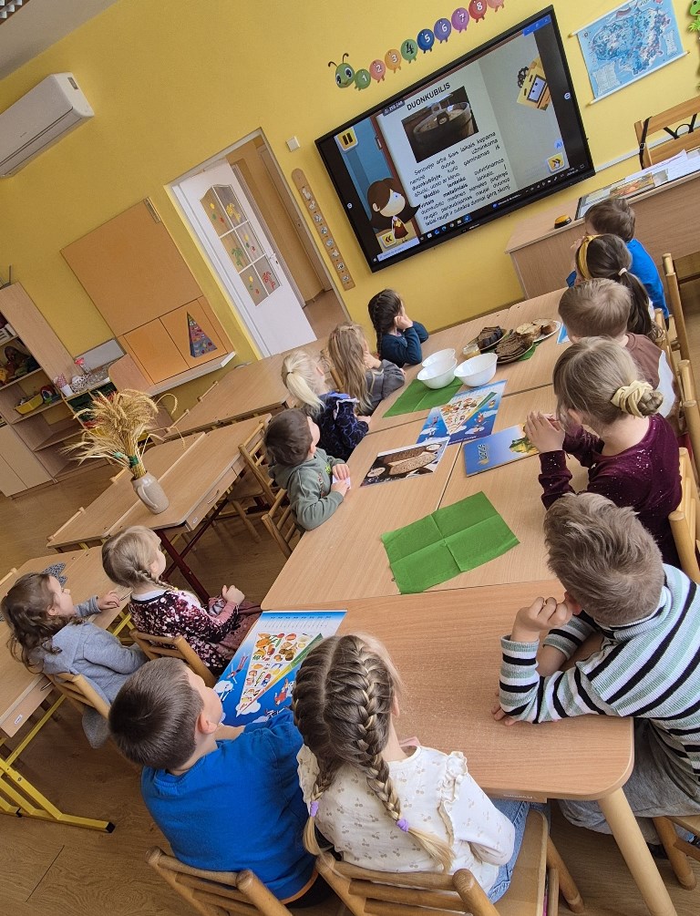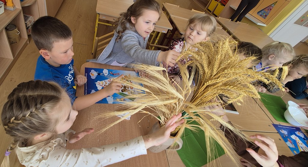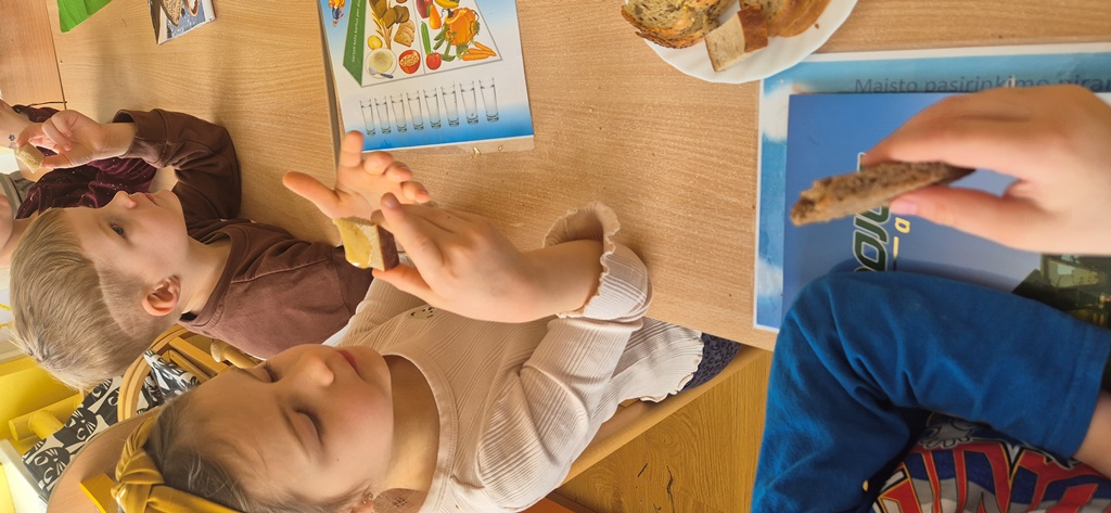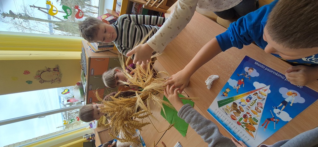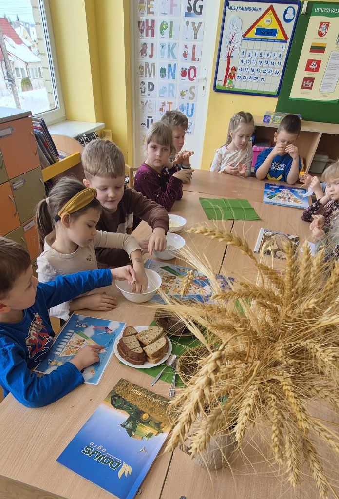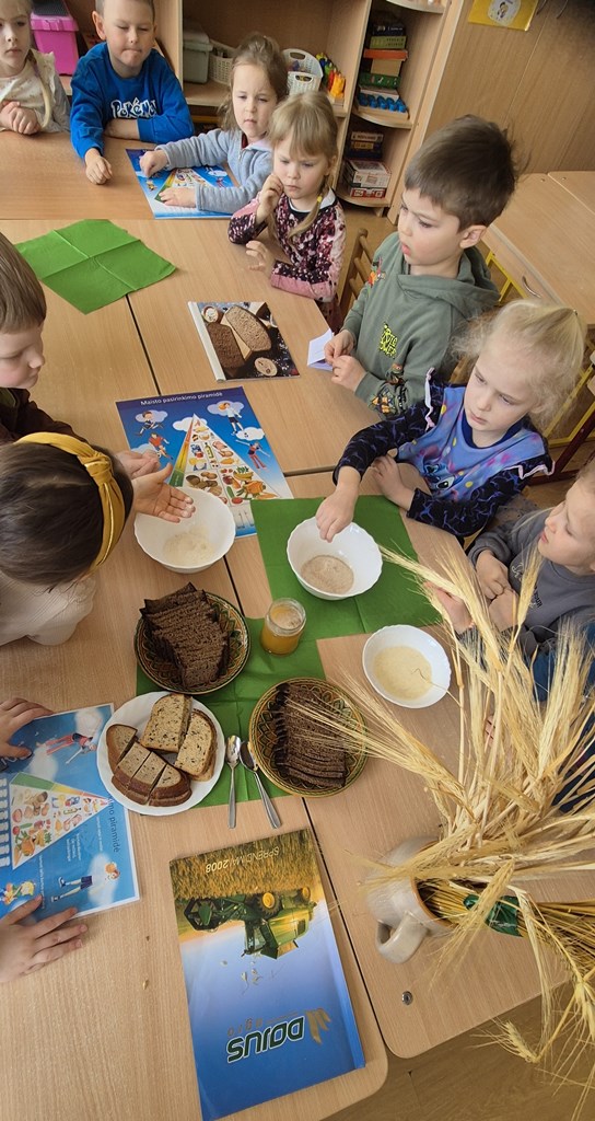 Viskas apie duonąMūsų Ramygalos lopšelio-darželio „Gandriukas“, „Kiškučių“, „Kodėlčiukų“ grupės vaikai dalyvavo pažintiniame užsiėmime „Viskas apie duoną“. Tai buvo kupina kvapų, skonių ir naujų atradimų diena. Užsiėmimo metu vaikai sužinojo, iš kur atsiranda duona ir koks ilgas jos kelias nuo grūdo iki mūsų stalo. Kalbėjomės apie javus – kviečius ir rugius, aptarėme, kaip jie auginami, pjaunami, malami į miltus. Ypatingą susidomėjimą sukėlė praktinė veikla – mažieji rankomis lietė skirtingus javus, juos apžiūrėjo, tyrinėjo ir bandė atskirti kviečius nuo rugių. Vaikai lietė miltus, manų kruopas bandė suprasti, kuo skiriasi skirtingos jų rūšys. Vaikai pastebėjo jų spalvos, formos ir dydžio skirtumus, dalijosi savo pastebėjimais. Užsiėmimo pabaigoje mažieji ragavo skirtingų rūšių duoną, gardintą medumi. Vaikai lygino skonius, aptarė, kuri duona jiems skaniausia, dalijosi savo įspūdžiais ir pasakojo, kokią duoną valgo namuose. Ši saldi patirtis suteikė daug džiaugsmo ir šiltų emocijų. Užsiėmimas praplėtė vaikų žinias apie duonos kelią, bet ir padėjo suprasti, kad duoną reikia gerbti ir tausoti, nes į jos atsiradimą įdedama daug žmonių darbo ir rūpesčio. Šį valandėlė buvo kupinas smalsumo, atradimų ir gerų emocijų – vaikai mokėsi per patirtį, tyrinėjimą ir bendrą veiklą.
