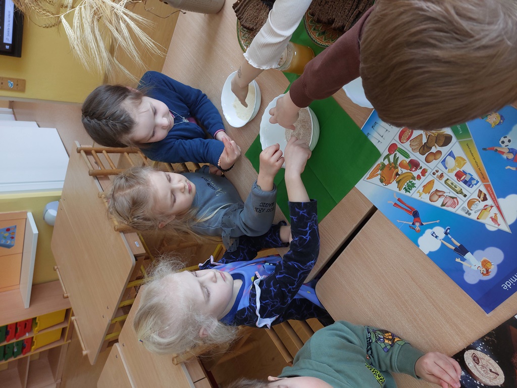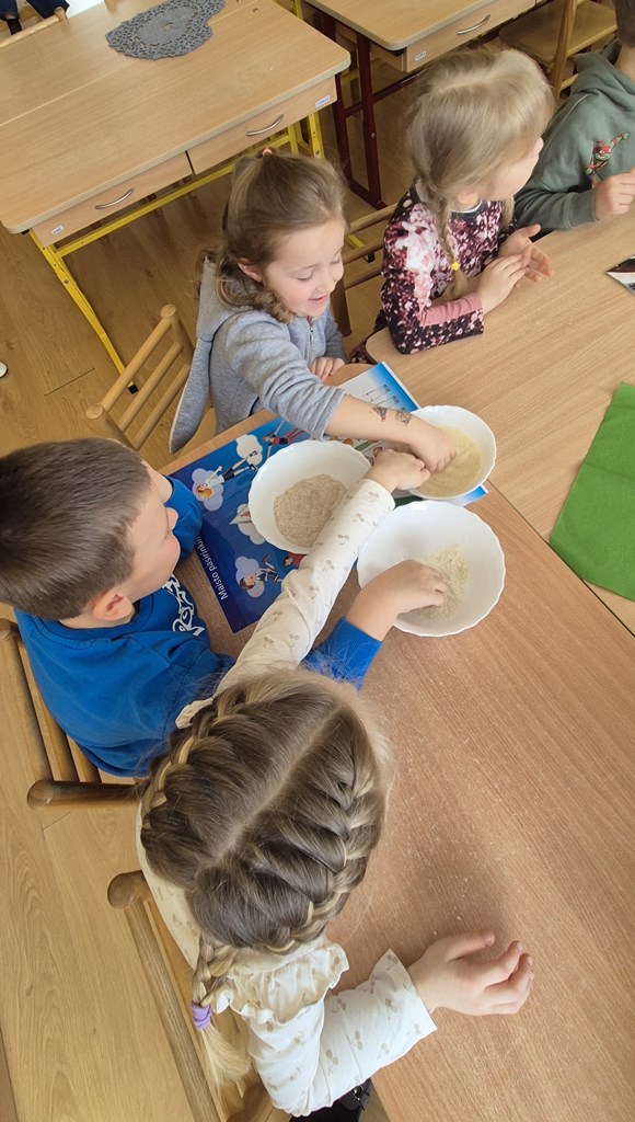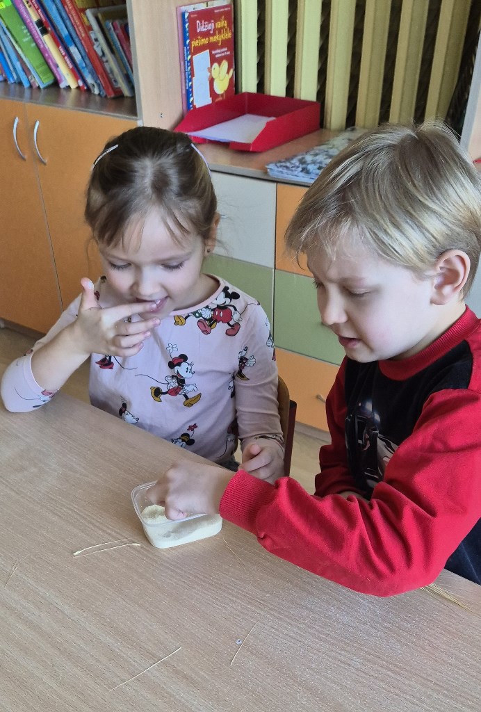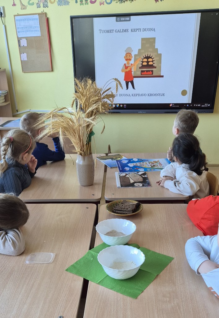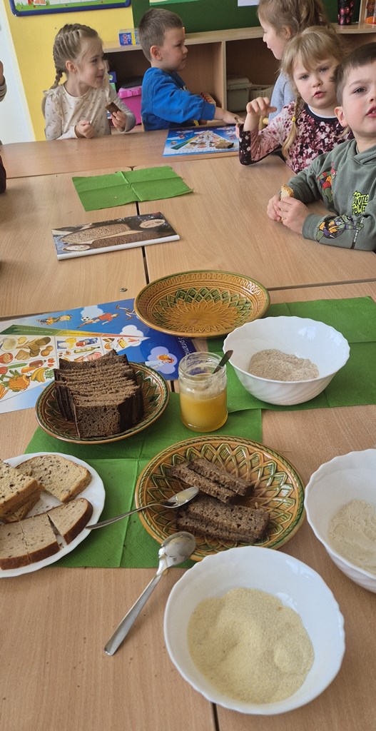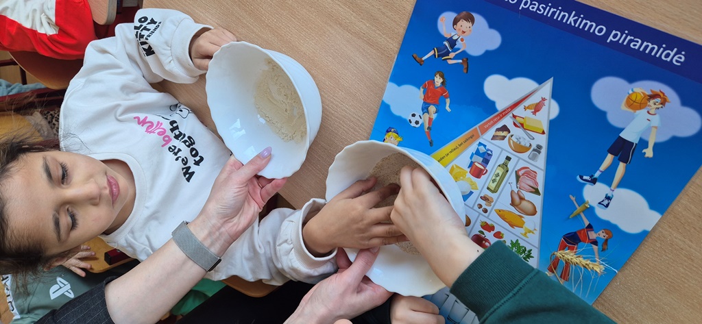 Viskas apie duonąMūsų Ramygalos lopšelio-darželio „Gandriukas“, „Kiškučių“, „Kodėlčiukų“ grupės vaikai dalyvavo pažintiniame užsiėmime „Viskas apie duoną“. Tai buvo kupina kvapų, skonių ir naujų atradimų diena. Užsiėmimo metu vaikai sužinojo, iš kur atsiranda duona ir koks ilgas jos kelias nuo grūdo iki mūsų stalo. Kalbėjomės apie javus – kviečius ir rugius, aptarėme, kaip jie auginami, pjaunami, malami į miltus. Ypatingą susidomėjimą sukėlė praktinė veikla – mažieji rankomis lietė skirtingus javus, juos apžiūrėjo, tyrinėjo ir bandė atskirti kviečius nuo rugių. Vaikai lietė miltus, manų kruopas bandė suprasti, kuo skiriasi skirtingos jų rūšys. Vaikai pastebėjo jų spalvos, formos ir dydžio skirtumus, dalijosi savo pastebėjimais. Užsiėmimo pabaigoje mažieji ragavo skirtingų rūšių duoną, gardintą medumi. Vaikai lygino skonius, aptarė, kuri duona jiems skaniausia, dalijosi savo įspūdžiais ir pasakojo, kokią duoną valgo namuose. Ši saldi patirtis suteikė daug džiaugsmo ir šiltų emocijų. Užsiėmimas praplėtė vaikų žinias apie duonos kelią, bet ir padėjo suprasti, kad duoną reikia gerbti ir tausoti, nes į jos atsiradimą įdedama daug žmonių darbo ir rūpesčio. Šį valandėlė buvo kupinas smalsumo, atradimų ir gerų emocijų – vaikai mokėsi per patirtį, tyrinėjimą ir bendrą veiklą.