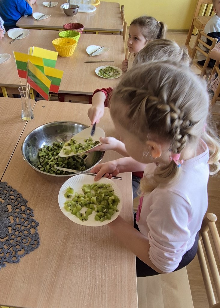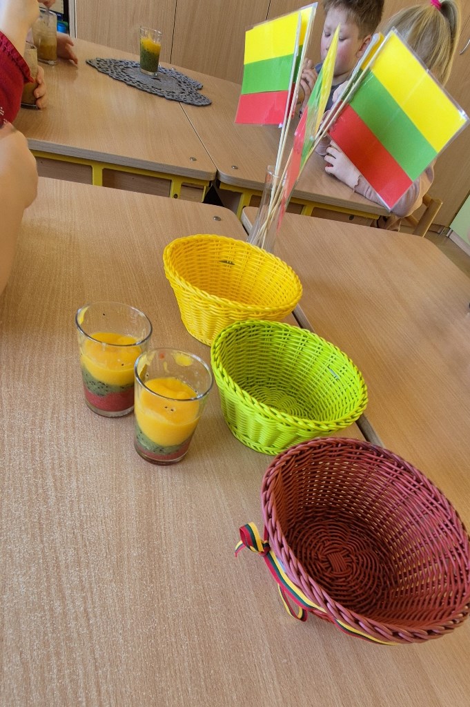 Vaisių kokteilis Lietuvos trispalvės spalvomisKovo 11-oji – ypatinga diena Lietuvai, kai minime Lietuvos nepriklausomybės atkūrimą ir džiaugiamės savo šalies laisve. Mūsų Ramygalos lopšelio-darželio „Gandriukas“ su „Kiškučių“ grupės vaikais šiai gražiai progai paminėti vaikams vyko smagus edukacinis–praktinis užsiėmimas „Trispalvis vaisių kokteilis“. Užsiėmimo metu visuomenės sveikatos specialistė vaikams pasakojo apie vaisių naudą organizmui ir juose esančius vitaminus. Mažieji aktyviai klausėsi, dalijosi savo žiniomis ir drąsiai įsitraukė į veiklą – patys pjaustė vaisius, o vėliau juos sublendravome ir pasigaminome gardų vaisių kokteilį. Iš trijų skirtingų vaisių spalvų, atsargiai sluoksniuodami į stiklinaites sudėjome Lietuvos trispalvės vėliavos spalvas. Vaikai smalsiai ragavo pagamintą kokteilį ir džiaugėsi ne tik jo skoniu, bet ir spalvingu rezultatu. Užsiėmimo metu mažieji sužinojo, kodėl vaisius svarbu valgyti kasdien ir kaip jie padeda augti stipriems bei sveikiems. Šis užsiėmimas ne tik ugdė sveikos mitybos įgūdžius, bet ir leido vaikams smagiai švęsti mūsų Tėvynės dieną – su spalvomis, skoniu ir šypsenomis!