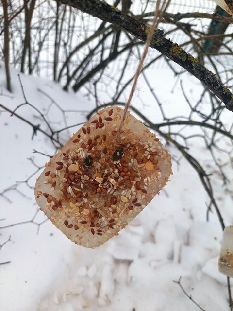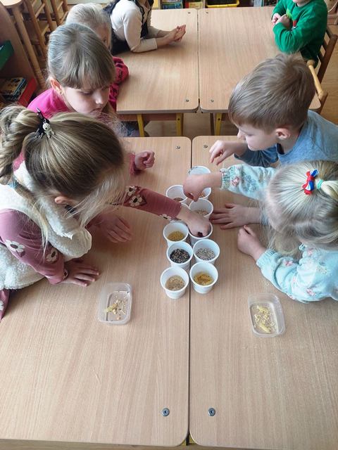„Ledo mozaikos paukšteliams“„Kiškučių“ grupės vaikai tyrinėjo vandens savybes – stebėjo, kaip jis užšąla ir vėl tirpsta. Kurdami ledo mozaikas iš kruopų, makaronų ir džiovintų gėlių, eksperimentavo su įvairiomis medžiagomis, dėliojo kompozicijas, lygino formas ir dydžius. Vaikai aptarė, kas nutiks, kai ledas ištirps, ir džiaugėsi galėdami prisidėti prie paukštelių globos. Ištirpus ledui, šios natūralios vaišės pradžiugins ir pamaitins paukštelius.